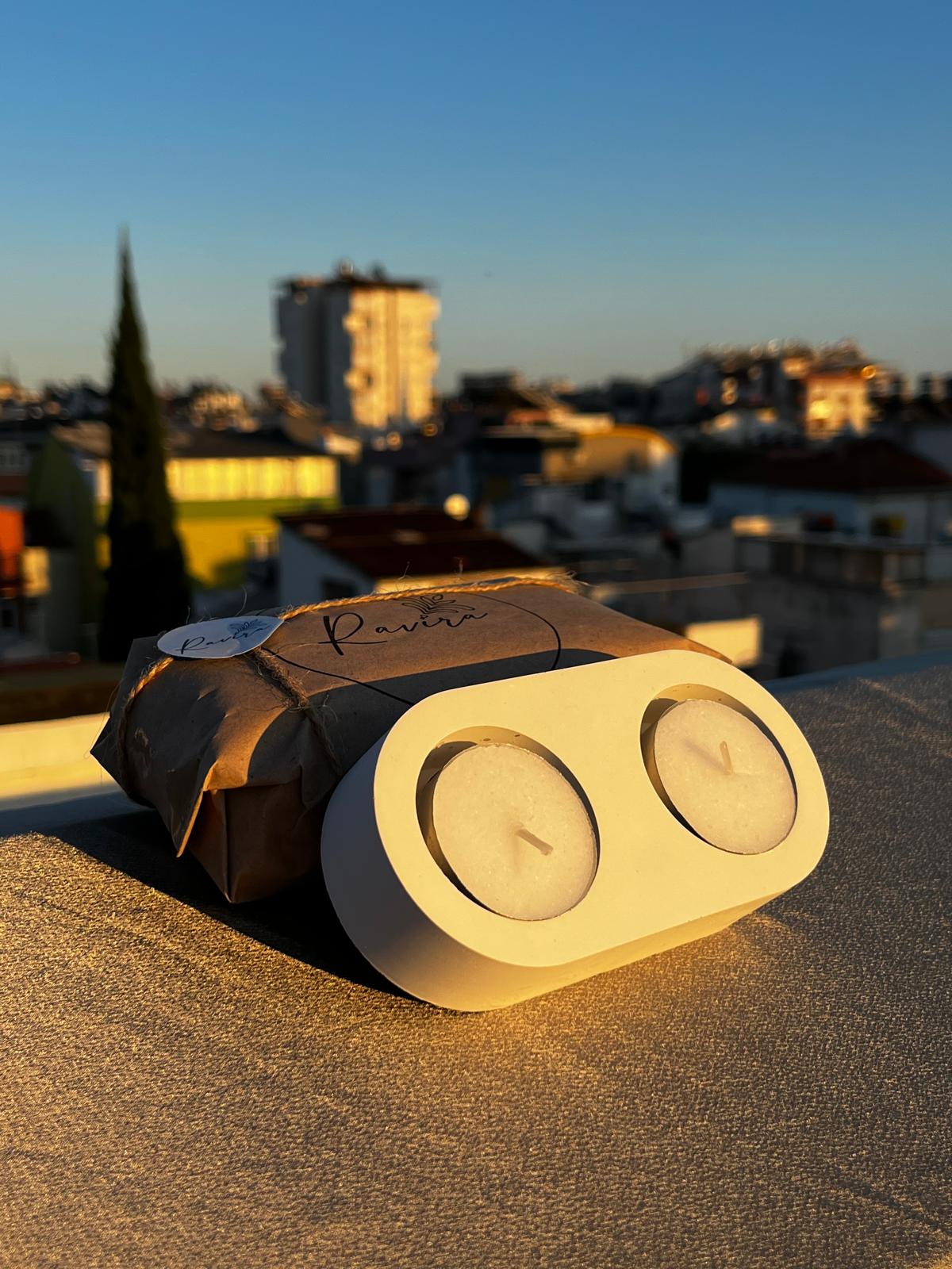 Minimal tasarımlı çift bölmeli mumluk. 4 adet mum ile birlikte.